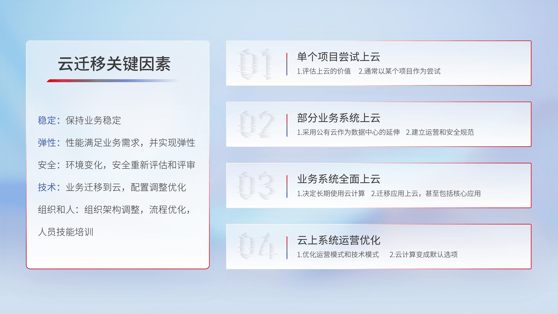 结合实际业务,,,,从规划设计、、云平台选型、、、云原生改造、、、、数据迁移、、、集成交付,,,迁移全过程为客户识别最佳上云路径,,,做好风险识别管理,,,设计网络架构、、身份权限、、安全审计合规、、操作审计、、、、日志审计、、、监控告警策略、、、多站点容灾设计等,,,,对云上基础设施进行整体规划,,提升IT治理水平,,,,以满足弹性、、、高可用、、高性能的需求。。。。