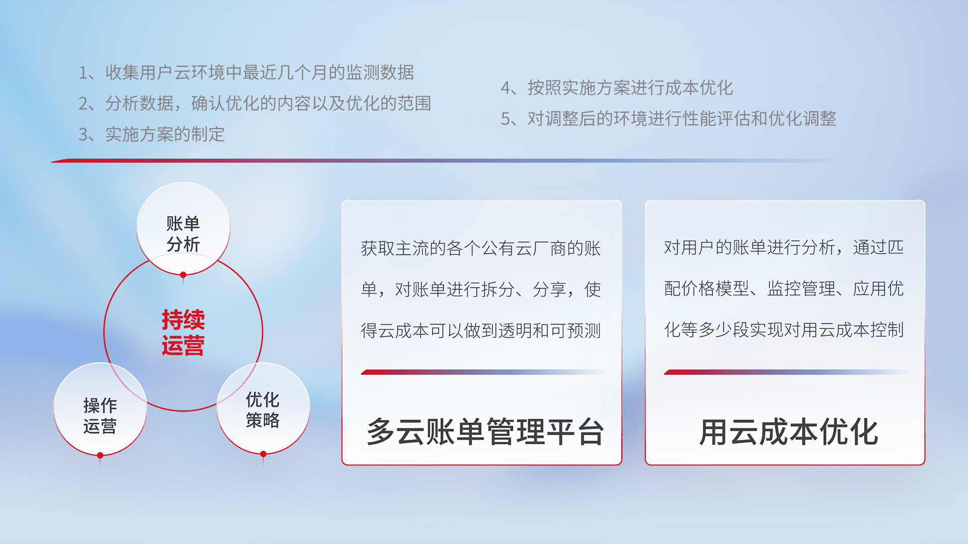 通过多云纳管,,,,以统一的资源数据模型把客户的云资源进行抽象和封装,,进而实现对多云资源的统一操作,,保障云资源管理的可靠性、、、、稳定性与可用性。。。量身定制化运维内容,,,配置、、、、开发运维、、、、补丁管理、、、、备份、、、、监控、、、、认证和访问管理、、、审计和日常巡检等,,,,保障在用云过程中的可靠度,,,稳定度以及高可用率。。。。